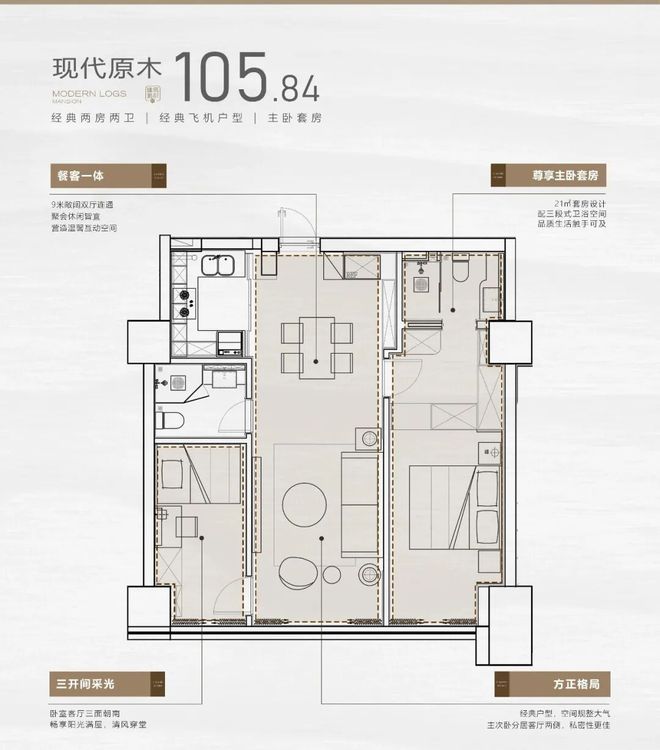 户型设计上,打破公寓常规暗间的局限,项目全部设计成全明2房或3房格局,做到没有一个暗间的居住空间,并全系标配主卧套房+双卫配置,提升居住配置。