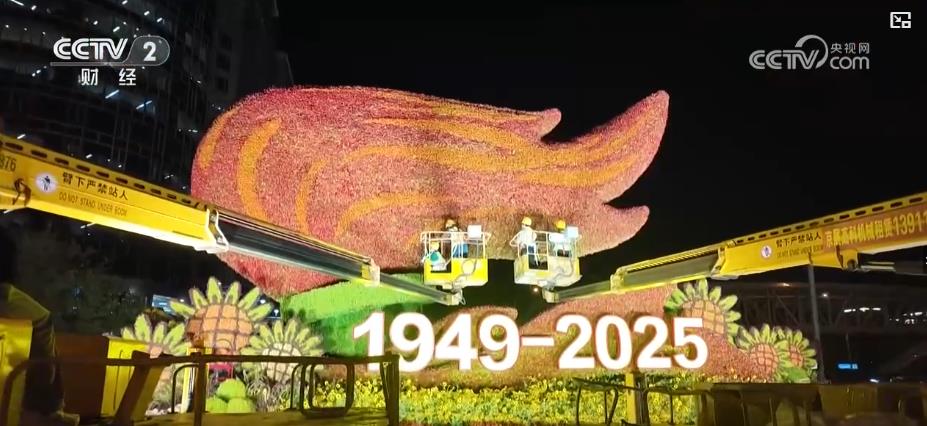 总台记者 邵薇:这里是东单西北角的立体花坛,它已经从之前纪念活动中的“薪火相传”更名为“继往开来”。现在我们看到工人已经进场施工了,首先我们看到的是大火炬上相关的标语已经去掉,为了配合国庆年号也从“1945”改为“1949”整个主题花坛当中要素更换较多的应该是地面装饰花材,比如说暗红色以及含蓄的黄会更换为亮红色和澄澈的金黄色,这也是为了烘托整个节日氛围,从之前的纪念活动的庄重到国庆的热烈喜庆。