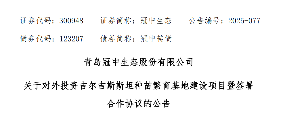 9月8日晚间,青岛冠中生态有限公司(以下简称“冠中生态”)发布公告称,公司拟在英属维尔京群岛、中国香港及吉尔吉斯斯坦设立全资子公司,并通过吉尔吉斯斯坦子公司投资建设种苗繁育基地。此举旨在推动公司海外业务发展,提升国际竞争力。